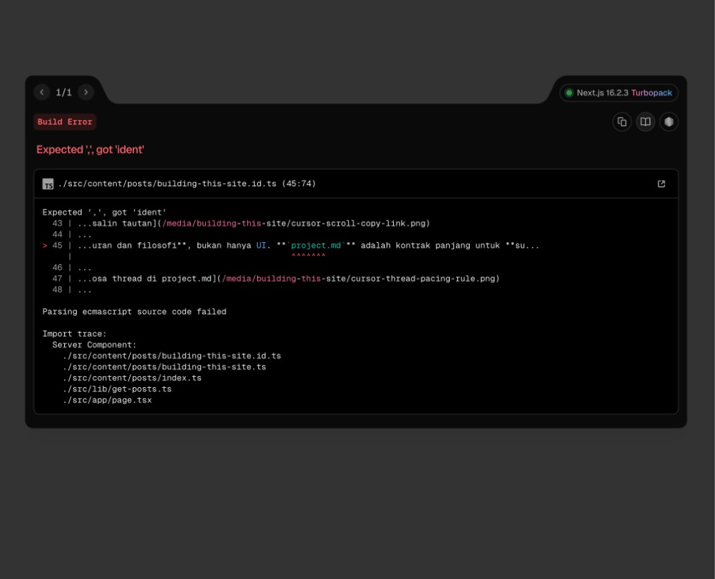 Some error is expected. Article bodies live in .ts as template literals; markdown-style backticks inside the string can kill the build fast. I screenshot the overlay, ask the agent to fix it, and keep going — same loop as features.
