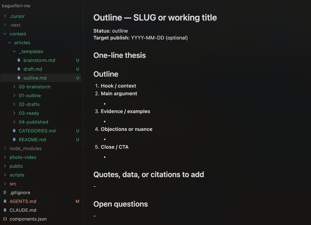 No hosted CMS as source of truth — git wins. content/articles/ holds numbered stages 00–04, templates, CATEGORIES.md, README — planning and taxonomy in the repo, not a dashboard.