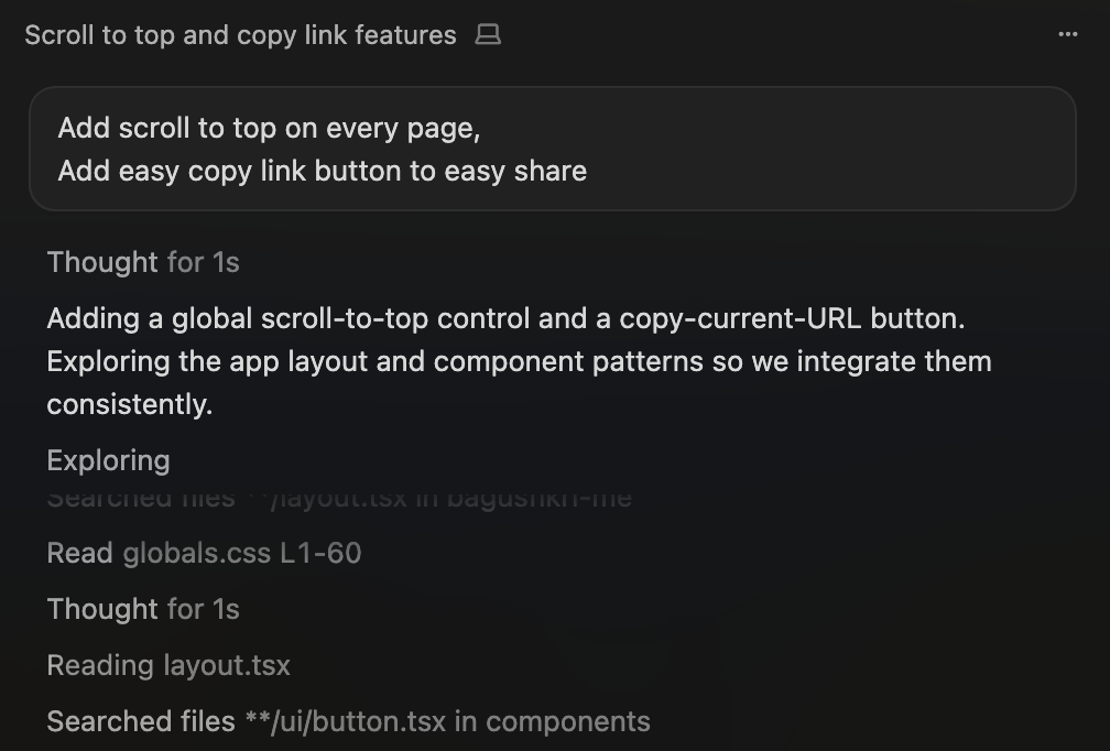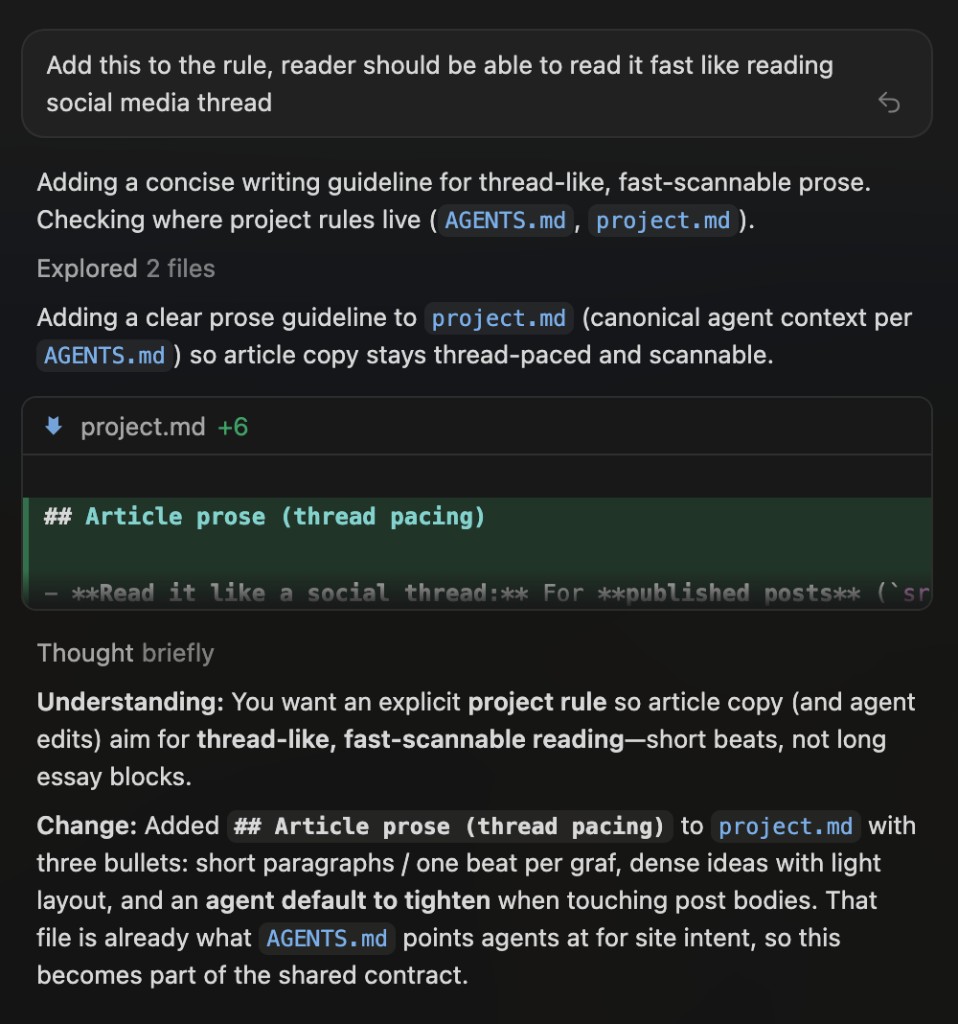 The same loop updates rules and philosophy, not only UI. project.md is the long-form contract for voice, layout, tokens, and what to refuse; AGENTS.md points agents at it and the Next.js guardrails. I extend both with the same plain-language asks I use for features — so agents don't just ship code; they inherit how to write and design this site. Below: adding thread-paced article prose.