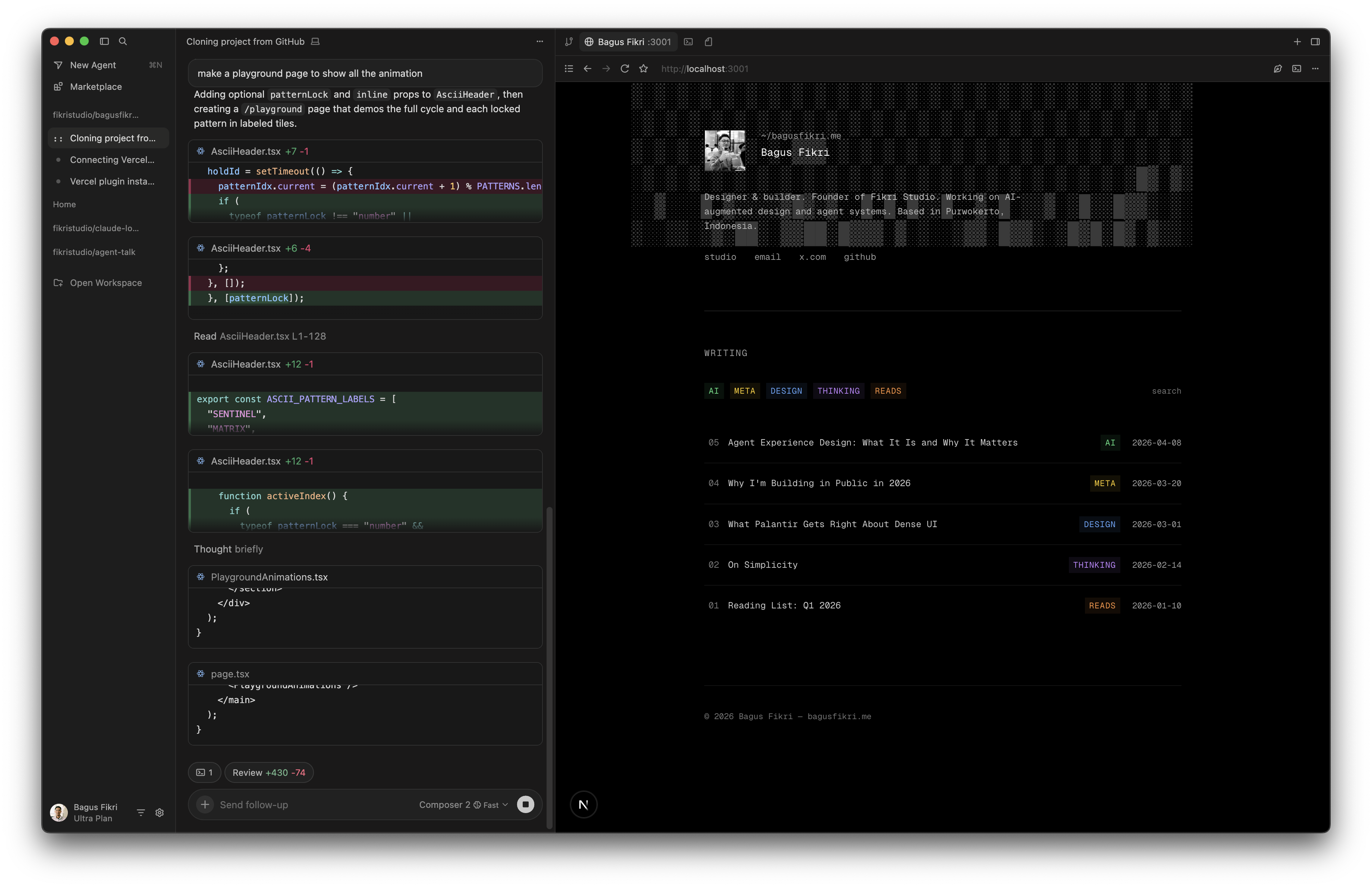 One editor, one repo, one deploy — the view below is the same object the session screenshots came from. The animation playground is a scratchpad route for motion before it touches the main shell.